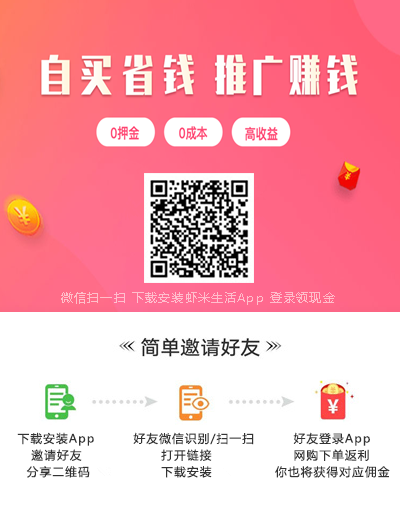 使用虾米生活App返利高、操作简单、现金到账以及每日上新等优势以外,还拥有终生推广提成奖励,二代三代返利提成,让你在购物的闲暇之时,还有一笔可观的收入,人人都可推广,分享佣金